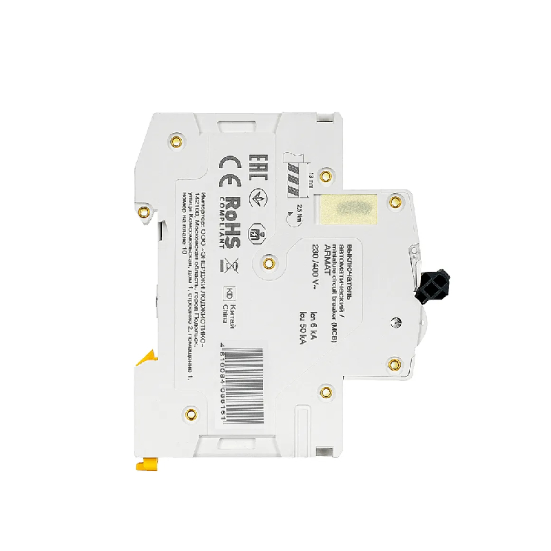 Автоматические выключатели ARMAT серии M06N предназначены для защиты цепей от перегрузки и короткого замыкания. Модельный ряд включает в себя устройства с характеристиками срабатывания B, C, D и номинальными токами от 0,5 до 63 А. Номинальная отключающая способность автоматических выключателей ARMAT серии M06N составляет 6 кА. Предельная отключающая способность варьируется в зависимости от номинала от 10 до 50 кА.